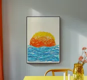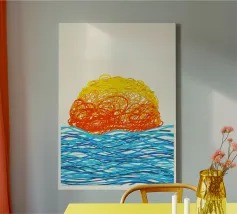 Dive into pure creative energy with this wildly expressive abstract seascape. A sun composed of chaotic, overlapping scribbles in fiery orange and golden yellow appears to dissolve into the atmosphere above rolling blue ocean waves. The frenetic line work creates a sense of heat shimmer and emotional intensity, as if the artist captured not just the scene but the feeling of standing before nature's spectacle. This piece celebrates spontaneity and raw artistic gesture, perfect for contemporary spaces that embrace bold, unconventional beauty and creative freedom.