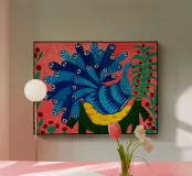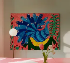 Questa affascinante opera d'arte di ispirazione popolare dell'artista ucraina Maria Prymachenko raffigura un gabbiano appollaiato protettivamente sul suo nido, reso nel suo caratteristico stile naïf e decorativo. I colori vivaci, i motivi giocosi e le forme stilizzate conferiscono calore e vitalità alla scena, celebrando la natura con una semplicità fantasiosa. Il suo carattere allegro e stravagante lo rende un'aggiunta deliziosa a salotti, camere per bambini, studi creativi e interni eclettici, dove il suo fascino folcloristico e la sua energia gioiosa possono essere pienamente apprezzati.