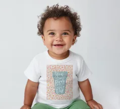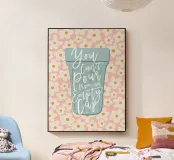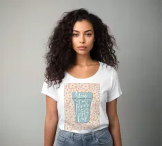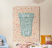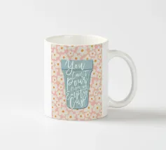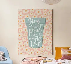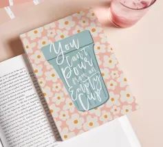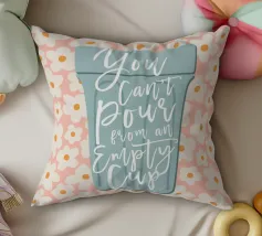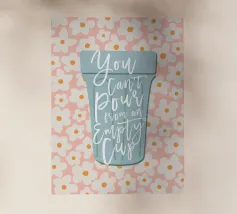 Self Care typography phrase 'You can't pour from any empty cup' depicting a coffee cup on a whimsical floral background. Encouraging wellness and taking care of oneself.