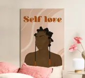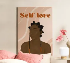 L'affiche murale "Self Love" est une œuvre d'art qui célèbre la beauté naturelle des cheveux afro et promeut l'amour de soi. Elle met en scène une femme portant fièrement une des coiffures emblématique de la culture noire, une déclaration audacieuse de la beauté authentique et de la confiance en soi.
