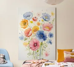 Delicato, rilassante e poetico: questo acquerello floreale con un tenue blu-violetto, delicati fiori e una farfalla porta in ogni casa la magia dei momenti di tranquillità nella natura. Ideale come murale in soggiorno, in camera da letto o nella stanza dei bambini - perfetto per gli amanti dell'arte botanica con una composizione di colori delicati e un aspetto rilassato.