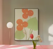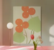 Una rappresentazione minimalista di bacche arancioni con foglie verdi. La composizione pulita e l'uso di forme semplici conferiscono un'atmosfera moderna.