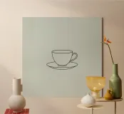 Semplice schizzo di una tazza da tè su un piattino esposto su un minimo plexiglass
