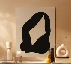 Una grande forma nera irregolare è posizionata al centro su uno sfondo più chiaro a contrasto, dall'aspetto ruvido e strappato. Il design è minimalista, con un'atmosfera astratta e una tavolozza di colori semplice.