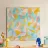A playful, modern abstract pattern featuring soft geometric curves and flowing shapes in a pastel color palette of blue, orange, and yellow. The design is happy, cute, and feminine, with a light, airy feel. The shapes interlock smoothly, creating a sense of movement while maintaining simplicity.