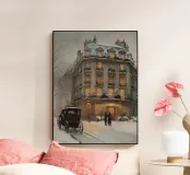 Un romantico paesaggio urbano dal sapore invernale: una carrozza nera trainata da cavalli si ferma nella neve fresca davanti a un magnifico edificio antico con finestre illuminate in modo caldo. Due persone elegantemente vestite sono impegnate in una conversazione, mentre i lampioni gettano una luce dorata sulla strada innevata. La scena racconta di un'epoca passata, dell'eleganza e della tranquilla bellezza di una serata innevata in città.
