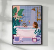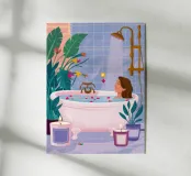 An illustration of two women relaxing together in a bubble bath, surrounded by lush plants. The scene is an intimate, serene, and beautiful depiction of shared self care and friendship.