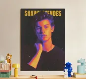 Un ritratto stilizzato di Shawn Mendes nei toni dell'arancione e del viola con il suo nome in grassetto giallo.