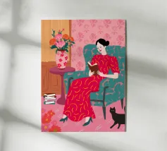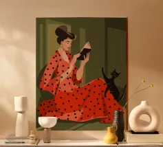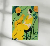 Questa composizione grafica combina la raffinatezza dell'Art Déco con una riduzione moderna. Una statuaria signora in abito giallo sole condivide un momento di tranquillità con il suo gatto, circondato da rose lussureggianti. Le linee chiare ricordano Toulouse-Lautrec e le xilografie giapponesi, mentre l'armoniosa palette di colori chartreuse, oro e smeraldo irradia pura freschezza. La femminilità senza tempo incontra la perfezione decorativa: un'opera d'arte che riempie gli ambienti con una grazia giocosa e una leggerezza mediterranea primaverile. Incantevole ed elegante!
