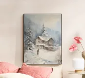 Un dipinto invernale pieno di tranquillità e di atmosfera: una singola figura si aggira per il sentiero innevato verso un'antica casa di montagna, circondata da maestosi abeti e da una leggera foschia montana. Le delicate tonalità di blu e la luce tenue conferiscono al quadro un'atmosfera pacifica e malinconica. Un omaggio alla solitudine e alla bellezza delle giornate invernali innevate.