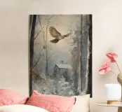 In una tranquilla foresta innevata, un gufo plana silenzioso su una capanna solitaria. I colori tenui e la luce soffusa conferiscono alla scena un'atmosfera misteriosa e pacifica. Questo suggestivo dipinto invernale cattura la bellezza della natura e la magia della solitudine invernale, simbolo di tranquillità e contemplazione.