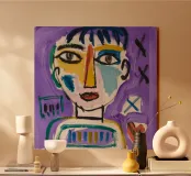 This painting features a simplistic abstract character with minimal lines and a mix of pink, green, and brown hues. The background is clean and uncluttered, emphasizing the simplicity of the design.