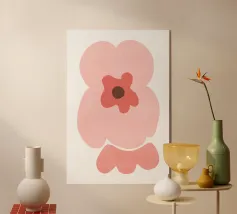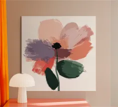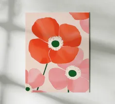 Il design semplicistico di un fiore presenta una composizione di petali rosso-arancio con un centro verde e uno stelo verde chiaro, che conferisce un'estetica giocosa e di carta tagliata. I colori vivaci e le forme geometriche creano un aspetto moderno e astratto.