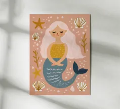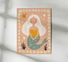 The illustration shows a cheerful mermaid with long, flowing blue hair, rosy cheeks and a broad smile. Her top is reminiscent of fish scales and her tail fin is blue with green accents. The style is playful and childlike, with clean lines and bright colours. The texture in the background gives the picture a handmade, charming touch.