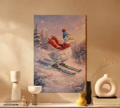 Un'allegra anatra sugli sci - avvolta in sciarpa e cappello, pronta per il divertimento invernale! Questo motivo giocoso combina un'illustrazione umoristica con colori caldi e un'atmosfera festosa. Perfetto per le camere dei bambini, per le decorazioni invernali o semplicemente per un sorriso. Il disegno irradia gioia, movimento e un pizzico di magia natalizia: l'ideale per chi ama l'umorismo e il cuore nella propria arte.