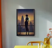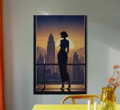 A graceful silhouette of a woman overlooking a glowing city skyline as the sun sets behind skyscrapers. Sleek minimalism meets soft evening light, creating an urban yet poetic atmosphere.