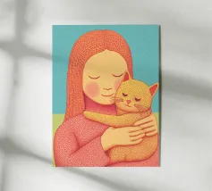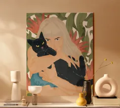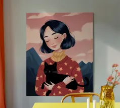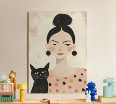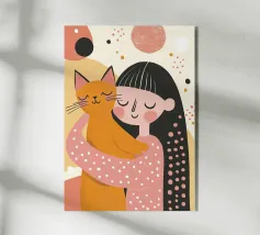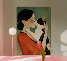 Una persona che indossa un vivace top arancione tiene vicino un elegante gatto nero, i loro sguardi sono allineati, evidenziando il forte legame tra l'uomo e l'animale domestico su uno sfondo semplice e dai toni caldi.