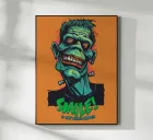 A colorful, cartoon-style illustration of a grinning Frankenstein-inspired monster with glowing green skin and exaggerated teeth. The vibrant design features bold lettering saying "SMILE! It May Never Happen" in a playful and spooky tone.