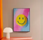 Faccina colorata su sfondo rosa e blu, dipinta a mano in stile minimalista ad olio. Perfetto per le camere dei bambini, i libri per bambini o le decorazioni allegre per le stanze. Colori vivaci, forme semplici e scene oniriche per il buon umore.