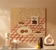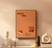 "Snack Time" Dessert Poster! A cozy, appealing illustration featuring a slice of pumpkin or pecan pie, chocolate chip cookies, caramel chocolates, and a mug of hot chocolate with a gingerbread man marshmallow. This design is perfect for adding a warm and cozy touch to a kitchen, dining room, or cafe area. The orange background and rich food colors create an inviting, comfort food atmosphere. Ideal wall art for lovers of desserts and a relaxing snack!