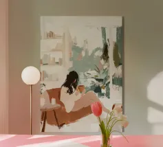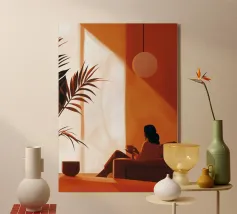 Mescolando toni di metà secolo e grazia moderna, questo pezzo esplora l'intersezione tra forma e solitudine. La palette di colori tenui e la geometria audace riecheggiano la presenza tranquilla della donna, creando una composizione che sembra un jazz visivo, sofisticato e senza sforzo.
