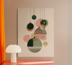 This abstract artwork blends modern clarity with vintage warmth through a composition of rounded geometric forms arranged in a loose grid. Overlapping shapes create gentle intersections, where transparency and color layering generate depth and visual rhythm. A muted palette of ochre, olive, terracotta, blush, and cream evokes mid-century design while remaining distinctly contemporary. Subtle surface texture adds a tactile quality, softening the structure. The piece balances order and fluidity, offering a calm yet engaging visual experience ideal for modern, minimalist interiors.