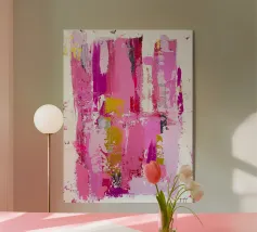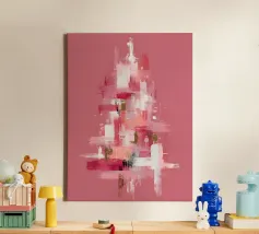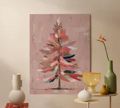 Albero di Natale astratto rosa da parete. Moderna stampa natalizia con morbida texture pittorica e toni invernali femminili.
