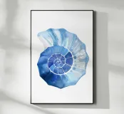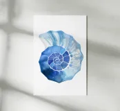 Eine blaue Nautilus-Muschel in sanften Blautönen vor einem weißen Hintergrund strahlt Ruhe und Ästhetik aus. Ihre spiralförmige Form und schlichte Schönheit laden den Betrachter ein, die Geheimnisse der Unterwasserwelt zu erkunden. Ein zeitloses Kunstwerk im maritimen Stil.