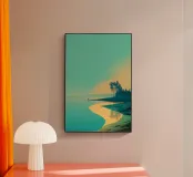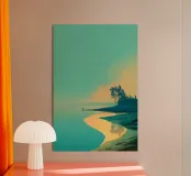 Un momento di pace catturato in un minimalismo astratto: questo paesaggio marino da sogno fonde un morbido cielo turchese con sabbie dorate, evocando una riflessione tranquilla e un profondo senso di calma. Una figura solitaria cammina lungo il bordo della serenità.