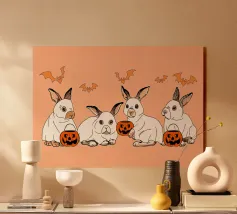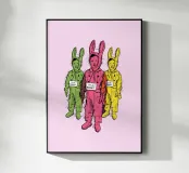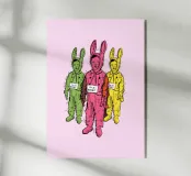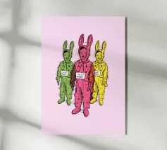 Un'eccentrica illustrazione a inchiostro e pennarello con tre figure colorate vestite da conigli - in egual misura giocosa e surreale.