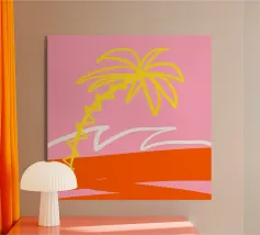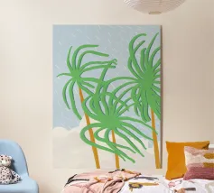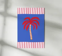 Una palma solitaria si affaccia su un mare azzurro e calmo, con soffici nuvole bianche che fluttuano nel cielo. La scena è pacifica e trasmette un senso di solitudine e semplicità tropicale.