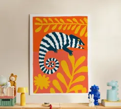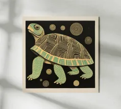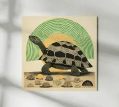 Scivolate nella calma con questa tartaruga a fantasia vista dall'alto, con gli anelli geometrici del guscio che orbitano come antichi mandala su un mare di terracotta brunita. Il disegno, che richiama stampe giapponesi d'epoca e motivi folkloristici, unisce il calore della terra a un'audace precisione grafica. I pigmenti d'archivio conservano ogni sfumatura rasserenante, per dare un'impronta di fondo a uffici, studi di yoga o interni costieri. Simboleggiando la longevità, la saggezza e i progressi costanti, il disegno ci ricorda ogni giorno di rallentare, respirare e avere fiducia nel viaggio. Ideale per regali consapevoli o per angoli di rifugio personale alla ricerca di una tranquilla concentrazione.