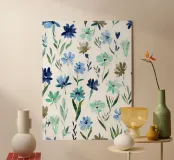 Loose watercolor florals in soft blues, mint greens, and earthy taupes scatter across a crisp white background. This breezy composition captures the lightness and spontaneity of spring wildflowers in bloom.