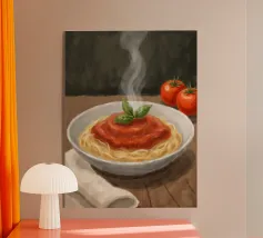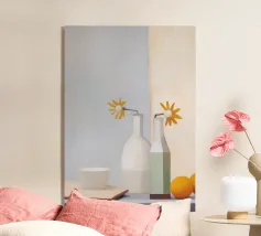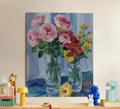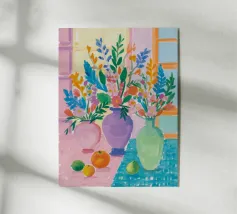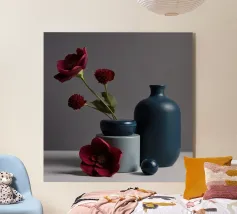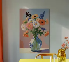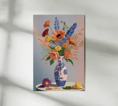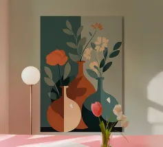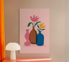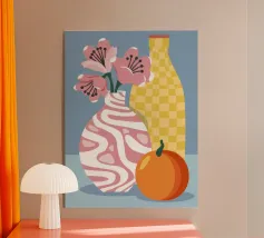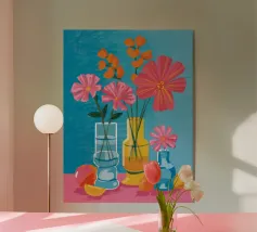 Elegante poster di natura morta con vasi in ceramica dai toni pastello riempiti di fiori sbocciati rosa e arancioni, su un morbido sfondo blu. Perfetto per aggiungere un tocco artistico e sereno agli interni moderni. Ideale per gli amanti dell'arte e dell'arredamento in cerca di ispirazione floreale.