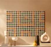 Piastrelle quadrate in Marocco. Piastrelle in nero, arancione, verde.