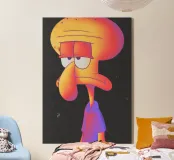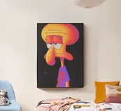 Un personaggio dei cartoni animati con un grande naso e un'espressione stanca, che si illumina di tonalità arancioni e viola.