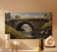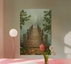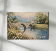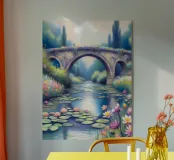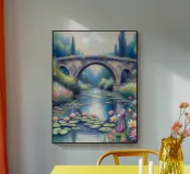Disegno a pastello di un ponte con laghetto di ninfee sottostante.