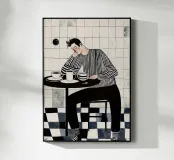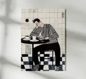 Questa illustrazione evocativa cattura un momento di tranquillità in una caffetteria, resa in una sofisticata tavolozza monocromatica con sottili accenni di calore. Un uomo con i capelli scuri, vestito con una vistosa camicia a righe e pantaloni neri, siede pensieroso a un piccolo tavolo rotondo, con la testa appoggiata alla mano. Accanto a lui, diverse tazze di caffè suggeriscono una presenza persistente. Sullo sfondo, una parete piastrellata e un pavimento a scacchiera aggiungono profondità e interesse visivo. Questo pezzo incarna perfettamente l'estetica di una caffetteria accogliente e introspettiva, fondendo uno stile senza tempo con la sensibilità dell'arte moderna.