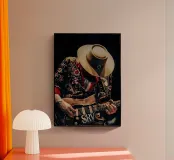 Un chitarrista con un cappello a tesa larga e una giacca a fiori suona una Fender Stratocaster usurata con la scritta "SRV".