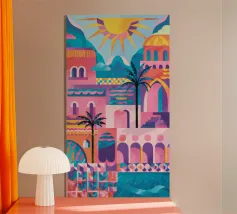 Una ventata di aria fresca attraversa Stoccolma con questo poster dai vivaci colori pop. La torre del municipio, le barche a vela, le isole e persino una tipica bicicletta sono tutti stilizzati in un cocktail di rosa, blu e giallo che celebra lo spirito creativo e naturale della capitale svedese. Una città d'acqua, di architettura e di dolcezza scandinava.