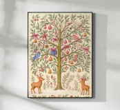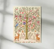 Un magico albero di Natale rosa pieno di sogni pastello: delicati cerbiatti, uccellini canterini, campanelle dorate e fiocchi rosa portano un dolce fascino festivo alla vostra casa. Ispirata ai libri di fiabe d'epoca e all'arte botanica, questa stravagante illustrazione unisce calore, natura e nostalgia. Perfetta per salotti accoglienti, camerette o come stampa murale per le vacanze senza tempo.
