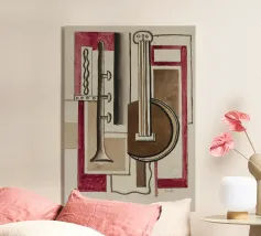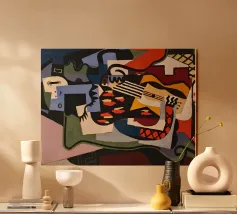 Un moderno dipinto astratto con forme geometriche che formano chitarre, violini e note musicali in una composizione audace e colorata. Lo sfondo strutturato e la disposizione dinamica evocano un senso di ritmo e di espressione artistica.