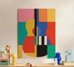 A modern abstract painting featuring geometric shapes forming guitars, violins, and musical notes in a bold, colorful composition. The textured background and dynamic arrangement evoke a sense of rhythm and artistic expression.