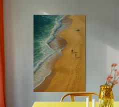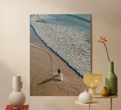 Questa stampa artistica sulla spiaggia cattura una prospettiva aerea di una persona che cammina mano nella mano con il suo cane lungo un tratto di sabbia incontaminato. La luce soffusa del sole immerge la scena in una calda luminosità, esaltando i disegni naturali della sabbia e proiettando ombre allungate. Le dolci onde lambiscono ritmicamente la riva, creando un delicato contrasto tra l'acqua azzurra e la spiaggia color crema. La composizione armoniosa e la gradazione di colori tenui evocano la compagnia, l'avventura e la riflessione pacifica. Perfetto per uffici, soggiorni o spazi di ritiro che celebrano la connessione e la tranquillità costiera.