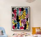 The heavy, textured line work contrasts with the flat yet slightly distressed color fields, producing depth and movement. Shapes overlap and interrupt one another, forming a visual dialogue between order and instinct. The composition balances control and raw expression, resulting in a powerful study of rhythm, contrast, a