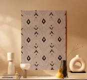 Dieser elegante, orientalische Weberei Illustration vereint moderne und vintage Elemente mit symmetrischen Rautenmuster in sanften Pastell- und Cremefarben, perfekt für einen Boho-Stil.