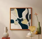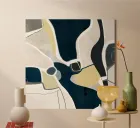 Abstract composition of various forms in shades of beige, off-white, dark navy blue and black. The shapes are irregular and layered, with areas of solid color and areas of texture. Some white lines and strokes define the edges of the shapes. The piece is predominantly neutral tones with pops of yellow ochre. The composition is balanced, with shapes of varying sizes placed throughout the image. Colors are muted and create a calm and serene atmosphere. The overall impression is one of organic forms and textures.