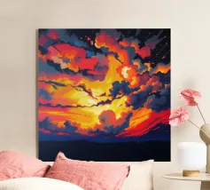 Late August evening. In the blue sky, the clouds dyed by the setting sun spread dynamically over the mountains in the distance.