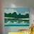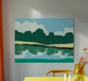 Lush green hills are juxtaposed against a sky filled with fluffy white clouds, while below, their reflection is mirrored on the rippling water. The image uses a simple color palette and abstract shapes to evoke a serene landscape scene.
