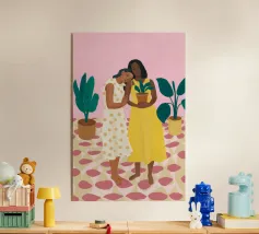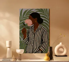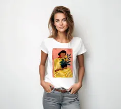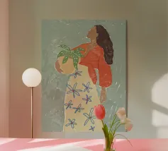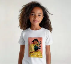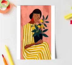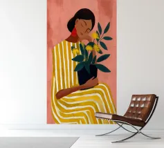 Siede in un tranquillo raccoglimento, con la luce del sole cucita sul suo vestito, il calore che le viene delicatamente avvolto tra le braccia. I fiori dorati fanno eco alla sua calma: aperti, vibranti, vivi. Con gli occhi chiusi e la testa inclinata, non ascolta le parole, ma il silenzio della crescita e della grazia. Nella sua quiete, qualcosa di radioso si radica.